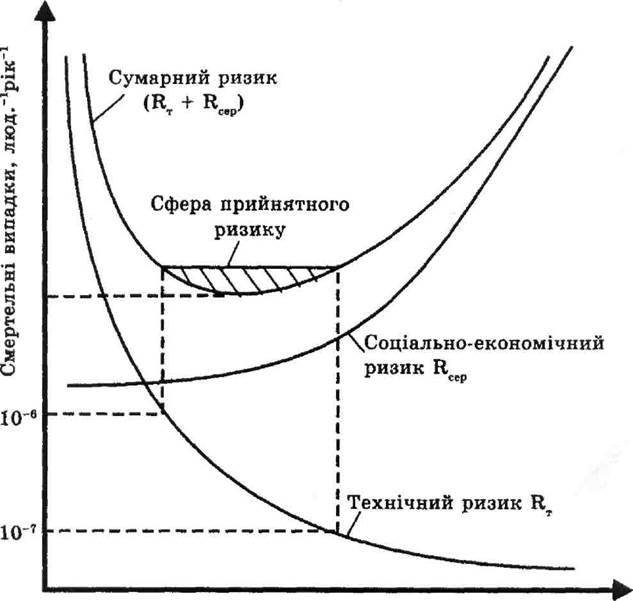 Ризик - це відношення числа тих чи інших фактичних проявів небезпеки до їх можливого теоретичного числа за певний період часу. На мал. 1 наведено спрощений варіант визначення прийнятного (допустимого ризику). При підвищенні витрат на удосконалення обладнання технічний ризик знижується, але зростає соціальний. Сумарний ризик має мінімум, коли створено необхідне співвідношення між інвестиціями в технічну і соціальну сферу. Ці обставини треба ураховувати під час вибору прийнятного ризику. Рівень прийнятного ризику за міжнародною домовленістю вирішено рахувати в межах 10-7... 10-6 (смертельних випадків люд-1-рік-1), а величина 10-6 є максимально прийнятим індивідуальним ризиком.