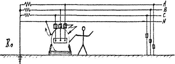 Опір заземлювача нульової точки трансформатора повинен відповідати встановленим нормам. Для мережі 380/220 В => R< 4 Ом Захисна дія занулення виявляється в тому, що при пробої ізоляції (тобто при замиканні фази мережі на корпус) через нульовий захисний провідник буде забезпечене коротке замикання фази з нульовим провідником мережі. Сила електричного струму короткого замикання буде велика, розплавиться плавкий запобіжник і відключить аварійну фазу від корпусу, тобто відключиться пошкоджене електрообладнання від електричної мережі. Однофазні споживачі електроенергії (світильники, електричний інструмент та інші), які підключають між фазним і нульовим проводом електричної мережі, занулюють окремим третім провідником, який з'єднує корпус однофазного споживача із нульовим проводом мережі. Організаційні заходи та технічні засоби захисту від ураження електричним струмом До організаційних заходів по забезпеченню електробезпеки відносяться слідуючі: · допуск до роботи осіб, які пройшли медичний огляд, відповідне навчання і інструктаж; · перевірка правил безпеки і інструкцій відповідно з займаною посадою і виконуваною роботою; · призначення осіб, які відповідають за організацію і проведення робіт; · оформлення в установленому порядку початку і закінчення робіт або переведення на інші види робіт; · встановлення нормативних перерв в роботі; · виконання робіт по наряду не менше ніж двома особами; · організація нагляду за проведенням робіт; · додержання особливих вимог при роботах на струмоведучих частинах, які знаходяться під напругою або біля них. В якості основних технічних засобів захисту від ураження електричним струмом (використовуються роздільно або в сполученні один з одним) застосовують: · ізоляцію струмоведучих частин, проводів за допомогою діелектричних матеріалів; · недоступність проводів електричних мереж (повітряні ЛЕП виконують на опорах, а електричні кабелі прокладають у землі); · обгородження електроустановок (наприклад кожухами, огорожами, тощо); · блокувальні пристрої, які автоматично відключають електрострум в електроустановках, коли знімають з неї захисний кожух та інші; · малі напруги (не більше 42 В); · ізоляцію робочого місця (гумові килимки, тощо); · заземлення чи занулення корпусів електроустановок, які можуть потрапити під напругу при пошкодженій ізоляції; · вирівнювання електричних потенціалів; · автоматичне відключення електрообладнання при аваріях електромереж; · засоби індивідуального захисту; · попереджувальна сигналізація (світлова, звукова, написи, плакати, знаки); · ізолюючі вставки.