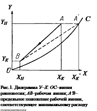 где Р – общее давление газа, Па. По найденным значениям Y* на Y-X -диаграмме строят график Y*=f(X) – линию равновесия. На Y-X -диаграмме (рис.1) проводят прямую через Yн параллельно оси ОХ до пересечения с линией равновесия, и, получают точку