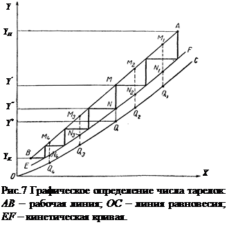 Исходя из изложенного, число тарелок можно найти графически следующим путем. Определив Е из формулы (51), проводят на У-Х -диаграмме ряд вертикальных прямых M1Q1, M2Q2 и т. д. и делят эти отрезки между рабочей линией и линией равновесия в отношении
