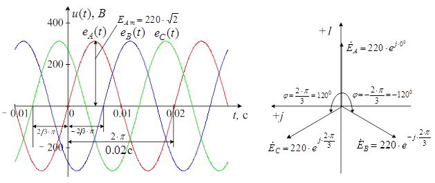 Лекция 4. Анализ линейных трехфазных электрических цепей переменного тока План лекции. 1. Основные схемы соединения трехфазных цепей. 2. Расчет режимов работы трехфазных цепей. 3. Мощность трехфазной цепи и способы ее измерения. Основные схемы соединения трехфазных цепей. Трехфазные цепи синусоидального тока. Электрическая цепь, состоящая из системы трех синусоидальных ЭДС, имеющих одну и ту же частоту и сдвинутых по фазе одна относительно другой на угол 2π /3 (120°), к которым с помощью соединительных проводов подключена нагрузка, называется трехфазной. Графики мгновенных значений трехфазной симметричной системы ЭДС с действующим значением каждой фазы