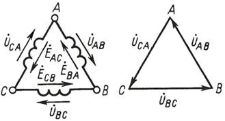 а) б) Рисунок 4.3 – Схема соединения трехфазных обмоток генератора звездой (а) и соответствующая векторная диаграмма напряжений (б) Обмотки генератора обозначают буквами А, В, С; буквы ставят: А – у начала первой, В – у начала второй и С – у начала третьей фазы. При соединении обмоток генератора треугольником (рисунок 4.4) конец первой обмотки генератора соединяют с началом второй, конец второй – с началом третьей, конец третьей – с началом первой. Геометрическая сумма ЭДС в замкнутом треугольнике равна нулю. Поэтому если к зажимам А, В, С не присоединена нагрузка, то по обмоткам генератора не будет протекать ток.