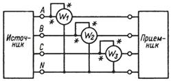 Рисунок 4.9 – Схема для измерения мощности трехфазной цепи с нейтральным проводом Активная мощность равна сумме показаний ваттметров: