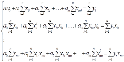Система (2.5) називається системою нормальних рівнянь для знаходження оцінок a0, a1, … am. У випадку, коли результативний показник залежить від двох факторів, тобто m=2, система нормальних рівнянь матиме вигляд: