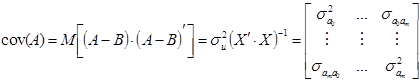 Якщо знайдемо значення оцінок А параметрів моделі, то можна знайти міру їх розсіювання, використавши для цього математичний апарат матричної алгебри. Знайдені оцінки є випадковими величинами, що мають певний розподіл імовірностей. Вони розсіюються навколо дійсного значення параметра В. Апарат матричної алгебри допомагає знайти не тільки дисперсії оцінок параметрів А, але й розрахувати значення коваріацій між двома параметрами аk та aj ( За означенням коваріаційна матриця для оператора А буде:
