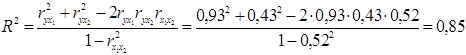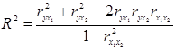 Квадрат коефіцієнта множинної кореляції, як і випадку простої регресії є коефіцієнтом детермінації, тобто має місце На практиці для обчислення значень коефіцієнтів множинної детермінації та кореляції, коли розраховані значення коефіцієнтів парної кореляції, використовують наступні формули: - коефіцієнт множинної детермінації: