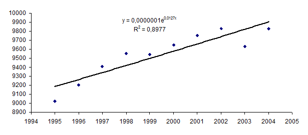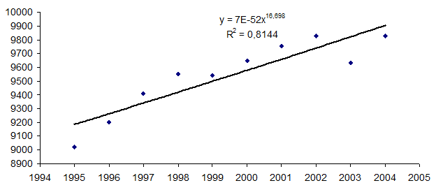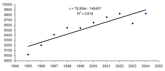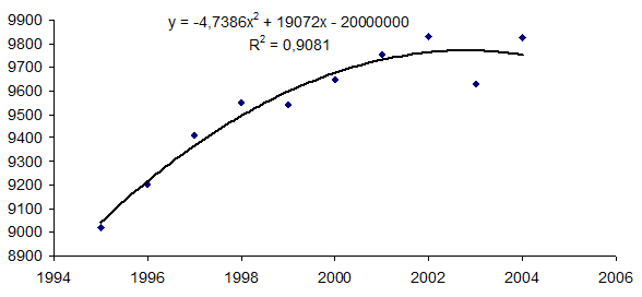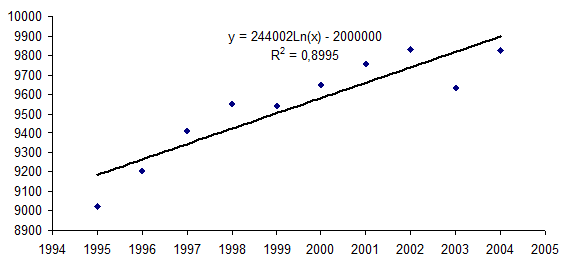 Занесемо дані валового випуску і роки в таблицю EXCEL і на їх основі будуємо діаграму розсіювання. Для цього лівою клавішею миші натискаємо на „Майстер діаграм”, отримуємо вікно „Мастер диаграмм: тип диаграммы”, вибираємо тип „Точечная”, натискаємо кнопку „Далее”, отримуємо вікно „Мастер диаграмм: источник данных диаграммы”, у віконечко „Диапазон” заносимо адрес області, де знаходяться вхідні дані, відмічаємо у віконечку яким чином записані дані – в рядках чи стовпцях, „Далее”, отримуємо вікно „Мастер диаграмм: параметры диаграммы”, забираємо лінії сітки, „Далее”, „Готово” і отримуємо діаграму розсіювання:
