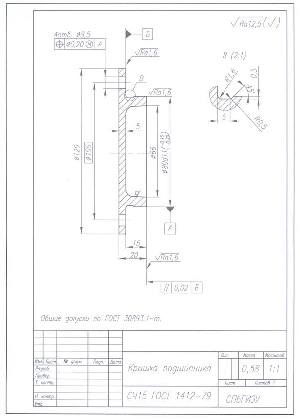 Целью контрольной работы №1 является изучение отдельных теоретических вопросов по теме №2 «Средства технологического оснащения литейного производства» и практическое использование полученных знаний при разработке чертежа отливки простейшей детали. Основные задачи контрольной работы: - получение знаний о технологических процессах литейного производства, изучение основных способов получения литых заготовок; - получения навыков расчета припусков и размеров отливки простейшей детали. При ответах на вопросы нужно выбрать вариант задания (см.п.4) и кратко изложить взятый из литературы материал с необходимыми рисунками, схемами, таблицами, расчетами, выполняя требования по выполнению реферата (см.п.5). Контрольная работа состоит из двух частей: 1) написание реферата по одному теоретическому вопросу; 2) расчет припусков и размеров отливки, построение чертежа заготовки. В отчете должны содержаться ответ на теоретический вопрос, таблицы с результатами расчета и необходимые пояснения, чертеж отливки по выбранному варианту. Порядок выполнения работы Во второй части работы необходимо выполнить выбор на основе расчета экономического эффекта способа получения заготовки для заданной детали. Деталью является крышка подшипника, конкретные размеры которой выбираются в соответствии с таблицей задания. Крышка является простой деталью из чугуна, к ней не предъявляются повышенные требования по точности. Исходя из этого, рационально проводить выбор между двумя конкурентоспособными видами литья: 1. литье в песчано-глинистые формы (ПГФ) средней плотности (от 120 до 160 кПа); 2. литье в кокиль без стержней (у детали отсутствуют отверстия или другие элементы, получаемые с помощью стержней). Расчеты рекомендуется проводить в следующем порядке: 1. Расчет припусков для двух вариантов получения отливок по ГОСТ 26645 – 85 с использованием программы PRIOTL; 2. Расчет массы отливок по двум вариантам с использование программы MASSA; 3. Выбор варианта получения заготовки по показателю приведенных затрат на годовой выпуск заготовок с учетом разности стоимости механической обработки деталей с использование программы EFFECT; 4. Для выбранного по расчетам варианта выполняется чертеж заготовки. Для облегчения выполнения работы ниже будет рассмотрен пример расчетов. Размеры детали приведены на рис. 1. Годовая программа выпуска деталей – 10000 штук в год.