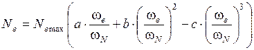 В формуле (1): Ne – мощность двигателя в любом режиме движения, кВт, при текущем значении угловой скорости коленчатого вала ω e; N 100% - мощность двигателя при полной подаче топлива и том же значении угловой скорости коленчатого вала ω e. Первой строится внешняя характеристика мощности двигателя (Рис. 1), в зависимости от угловой скорости коленчатого вала по формуле Лейдермана: