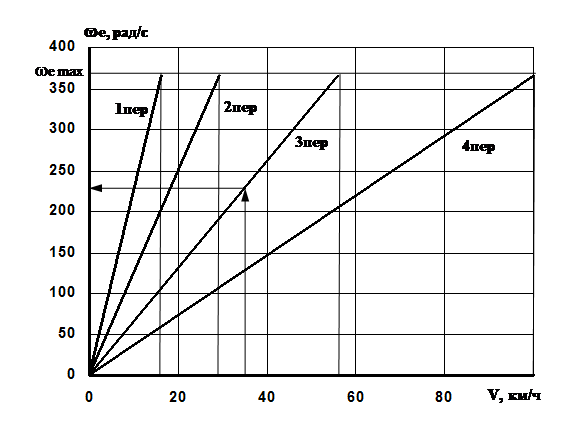 Этот вспомогательный график (Рис. 15) необходим для перевода линейной скорости движения автомобиля V в угловую скорость коленчатого вала двигателя ω е на выбранной передаче. По оси абсцисс откладывается линейная скорость движения автомобиля. По оси ординат – угловая скорость коленчатого вала двигателя. Суть построения графика заключается в том, что при максимальной скорости движения автомобиля на любой передаче коленчатый вал вращается с максимальной угловой скоростью.