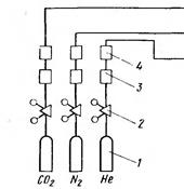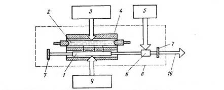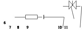 Рис. 2. Схема газового лазера: 1 – баллоны с газами; 2 – редукторы давления; 3 – стабилизаторы давления; 4 - регуляторы; 5 – смеситель; 6 – электромагнитный клапан; 7 – непрозрачное зеркало; 8 – излучатель; 9 – рубашка охлаждения; 10 – токовводы; 11- выходное зеркало.