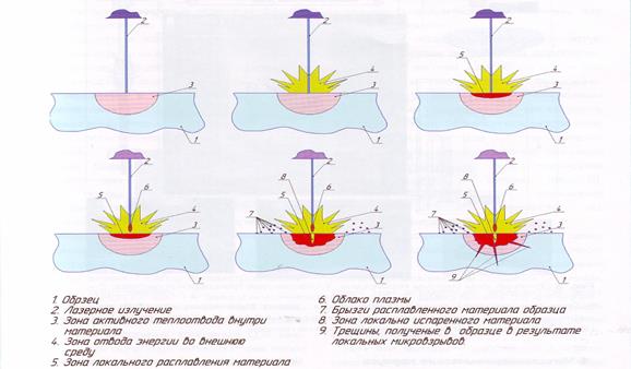 Этапы взаимодействия лазерного излучения с материалом иллюстрируются рис. 4. Рис. 4. Этапы взаимодействия лазерного излучения с веществом Плотность мощности лазерного воздействия зависит в значительной степени от диаметра пучка d: