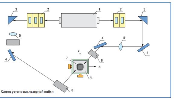 Рис. 7. Схема установки лазерной пайки выводов компонентов к контактным площадкам печатной платы