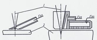 а б Рис. 9. Схемы защитных сопел: а - при сварке деталей малой толщины; б - при сварке с глубоким проплавлением; 1 - лазерный луч; 2 - свариваемые детали .