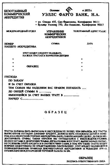Рис. 2.9.1. Пример аккредитива Он представляет эту тратту в свой нью—йоркский банк, который выплачивает ему обозначенную в ней сумму, полагая, что все условия поставки соблюдены. В результате этого соглашения экспортер получил свои деньги и не волнуется об оплате. Нью—йоркский банк затем отправляет тратту и другие документы в банк в Рио оговоренным способом, банк в Рио акцептует тратту и производит выплату нью—йоркскому банку. В свою очередь акцептованный вексель передается бразильскому импортеру и оплачивается им по прибытии товара в Рио и его поставке. Из данного описания видно, почему аккредитивы облегчают международную торговлю. Вместо предоставления кредита импортеру экспортер полагается на один или более банков, а их платежеспособность замешает платежеспособность импортера. Существуют отзывные и безотзывные аккредитивы, но тратты, выписанные по безотзывным аккредитивам должен акцептовать выпускающий банк. Это обязательство нельзя ни отменить, ни изменить без согласования всех сторон. Отзывной аккредитив может отменить или исправить выпускающий банк. Отзывной аккредитив определяет соглашение об оплате, но не гарантирует оплату тратты. Большая часть аккредитивов безотзывные, а описанный ранее процесс предполагает использование безотзывных аккредитивов. Три рассмотренных документа: тратта, коносамент и аккредитив – требуются при большей части международных сделок. Установлены правила ведения дел на такой основе. Вместе они предоставляют экспортеру защиту при продаже товаров неизвестным импортерам других стран. Они дают также и импортеру гарантии того, что товары будут перевезены и поставлены соответствующим образом. Финансовому директору следует знать механизм подобных сделок, если фирма занимается экспортом или импортом. Кредитная линия (Credit Line) представляет собой моральное (не контрактное) обязательство иностранного банка кредитовать клиента до определенного максимума. Как правило, клиент обязан держать в банке депозит в размере 10 % от суммы линии плюс 10 % от выбранных кредитов. Комиссия за обязательство не берется. Кредитная линия открывается обычно на год и может быть продлена при отсутствии нареканий со стороны банка. Одной из разновидностей кредитной линии, применяемой для краткосрочного финансирования, является учетная кредитная линия (Discount Credit Line), представляющая собой обязательство иностранного банка учитывать векселя клиента в пределах оговоренной суммы. Валютные свопы представляют собой обменные операции национальными валютами, выполняемые компаниями, представляющими разные страны. Необходимость подобных операций обусловлена тем обстоятельством, что в большинстве стран иностранные компании могут получить кредиты в местном банке на условиях менее выгодных, чем местные компании. Для того чтобы минимизировать расходы по обслуживанию кредитов, компании заключают между собой договор о валютном свопе, т. е. обмене долгосрочными кредитными обязательствами в одной валюте на равные обязательства в другой валюте. Схема операции очень проста. Предположим, американской компании А для финансирования своего английского филиала нужна сумма в английских фунтах с фиксированной процентной ставкой, эквивалентная 10 млн. дол. Она находит английскую фирму Б, которой нужна та же сумма, но в дол