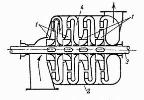 Рис. 4. Схема многоступенчатого центробежного насоса (четырехступенчатый насос с односторонним всасыванием): 1 – рабочее колесо; 2 – направляющий аппарат.