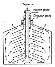 Рис. 6. Схема отстойной центрифуги непрерывного действия с горизонтальным валом и шнековой выгрузкой осадка. 1 – конический барабан; 2 – внутренний барабан; 3 – полый внешний вал; 4 – лопасти шнека; 5 – полый внутренний вал; 6 - кожух; 7 – окна во внутреннем барабане. Тарельчатый сепаратор (рис. 7). Отстойные центрифуги для разделения эмульсий часто называют сепараторами. Широко распространены тарельчатые сепараторы. Эмульсия по центральной трубе попадает в нижнюю часть вращающегося барабана (ротора) 1, снабженного рядом конических перегородок – тарелок 2, которые делят смесь на несколько слоев (тем самым достигается уменьшение пути, проходимого частицей при осаждении). Более тяжелая жидкость отбрасывается центробежной силой к периферии ротора, более легкая перемещается к его центру. Путь движения жидкостей показан стрелками. Разделившиеся жидкости не соприкасаются и поэтому не могут вновь смешиваться. Тарельчатые сепараторы характеризуются высокой производительностью и высоким качеством разделения, однако имеют достаточно сложное устройство.