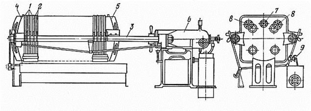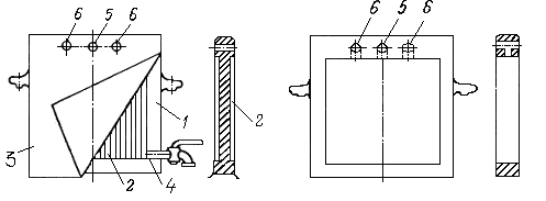 г д Рис. 2. Рамный фильтр-пресс а- общий вид: 1 - плиты; 2 - рамы; 3 - опорный брус; 4 - неподвижная плита; 5 - подвижная плита; 6 - гидравлическая система; 7 - подача суспензии; 8 - подача промывной жидкости; 9 - удаление фильтрата; б - плита; в - рама: 1 - гладкая поверхность плиты; 2 - желобок; 3 - фильтровальная перегородка; 4 - канал для выхода фильтрата и промывной жидкости; 5 - проходы для суспензии; 6 - проходы для промывочной жидкости; г, д - стадии фильтрования и промывки: 1 - средний канал для суспензии; 2 и 9- каналы; 3 - межплиточное пространство; 4- плиты; 5 — рамы; 6 — выход фильтрата и промывной жидкости; 7 - кран; 8 - боковой проход для промывной жидкости.