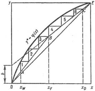 Рис. 2. Графическое определение числа теоретических тарелок; ОE-равновесная кривая; АВ и ВС- рабочие линия для укрепляющей в исчерпывающей частей колонны; 1-6-тарелки.