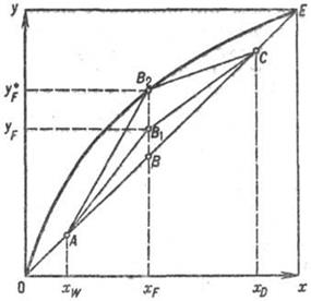 Первый предельный случай - бесконечно большое флегмовое число (R =,; колонна работает " на себя", то есть вся жидкость, полученная в результате полной конденсации паров в дефлегматоре, возвращается в колонну в виде флегмы; отбор дистиллята и выдача продукта не производятся, что в нормальных производств. условиях исключается; подобный режим удобен только для исследовательных целей), при этом рабочая линия совпадает с диагональю диаграммы. Отрезок b=xD(R+1), отсекаемый рабочей линией ABC на оси ординат, в соответствии с уравнением (2) равен нулю и, следовательно, изменение рабочих концентраций отвечает уравнению у = х, т. е. составы пара и жидкости равны в каждом сечении колонны. Второй предельный случай - рабочие линии пересекают равновесную кривую у*=f(х) в точке В2. Ректификация возможна, но поскольку в точке В2 движущая сила равна нулю (у* = у), для проведения процесса потребуется колонна с бесконечно большой поверхностью фазового контакта, работающая при минимальном флегмовом числе, которое составляет: