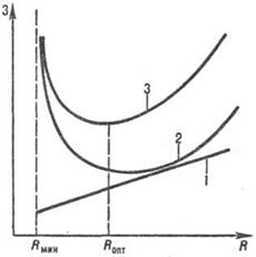 Рис. 4. К определению оптимального флегмового числа: 1-эксплуатационные расходы; 2-капитальные затраты; 3-общие затраты на ректификацию.