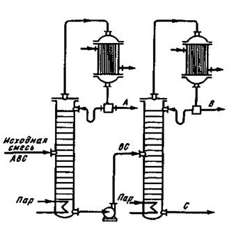 Первая колонна обеспечивает разделение смеси на А+ВС или АВ+С. Для последующего разделения смеси на п частей требуется ректификационная установка, состоящая из n - 1 ректификационных колонн.