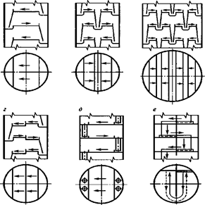 При выборе конструкции контактного устройства учитывают как их гидродинамические и массообменные характеристики, так и экономические показатели работы колонны при использовании того или иного типа контактных устройств. При выборе типа контактных устройств обычно руководствуются следующими основными показателями: а) производительностью; б) гидравлическим сопротивлением; в) коэффициентом полезного действия; г) диапазоном рабочих нагрузок; д) возможностью работы на средах, склонных к образованию смолистых или других отложений; е) материалоемкостью; ж) простотой конструкции, удобством изготовления, монтажа и ремонта. Основные принципы классификации тарелок. В настоящее время в промышленной практике известны сотни различных конструкций тарелок, которые можно классифицировать по способу передачи жидкости с тарелки на тарелку, по способу взаимодействия жидкой и паровой (газовой) фаз, по характеру диспергирования взаимодействующих фаз, по конструкции устройства для ввода пара (газа) в жидкость и др. По способу передачи жидкости различают тарелки со специальными переточными устройствами и тарелки провальные. У тарелок со специальными переточными устройствами жидкость перетекает с тарелки на тарелку отдельно от потока пара через специальные каналы (рис. VII-2). В зависимости от нагрузки по жидкости и технологического назначения колонны переток жидкости может осуществляться одним, двумя и более потоками (рис. VII-2, а —в). При применении тарелок с большим числом потоков следует учитывать, что при этом уменьшается длина пути жидкости на тарелке и, как следствие, снижается эффективность массопередачи. В пределах полотна тарелки течение жидкой фазы можно направить по горизонтальной поверхности или по слегка наклонной в сторону слива как в одном уровне, так и каскадом (рис. VII-2, г). Применение каскадных тарелок позволяет уменьшить значение градиента уровня жидкости, что обеспечивает в колоннах большого диаметра более эффективную работу тарелок. Однако в этом случае увеличивается расстояние между тарелками и усложняется конструкция полотна. При низких значениях нагрузки по жидкости обычно используют переливные трубы (рис. VII-2, д) или специальные конструкции переливов с кольцевым движением жидкости на тарелке (рис. VII-2, е). В последнем случае корпус аппарата и полотно тарелки разделяются вертикальной перегородкой на две части, что позволяет вдвое уменьшить длину сливной перегородки и увеличить нагрузку по жидкости на единицу длины сливной перегородки.
