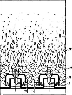Р ис. VII-7. Схема работы барботажной тарелки с круглыми колпачками: а — общий вид тарелки; 6 — схема барботажа газа в зоне контакта