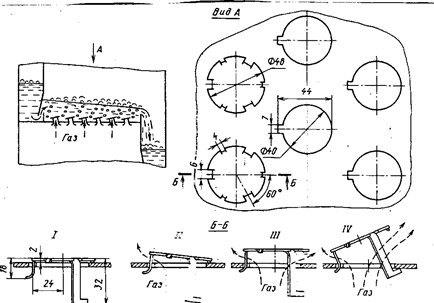 В зависимости от фиктивной скорости движения газа можно выделить три основных режима: пузырьковый, пенный и струйный. Пузырьковый режим реализуется при малых нагрузках по газу, когда он барботирует сквозь слой жидкости на тарелке в виде отдельных пузырьков. Пенный режим устанавливается при больших расходах газа. Газ проходит в слой жидкости в виде струй, которые на некотором расстоянии от отверстий распадаются на множество мелких пузырьков с образованием пены. В этом режиме максимальны газосодержание e и удельная поверхность контакта фаз Струйный режим наблюдается при дальнейшем увеличении скорости газа, когда газовые струи проходят сквозь слой жидкости не распадаясь. При этом образуется большое количество крупных брызг и резко падает высота барботажного слоя, что приводит к уменьшению поверхности контакта фаз по сравнению с пенным режимом. Унос жидкости по сравнению с пенным режимом возрастает за счет увеличения скорости газа, но снижается за счет увеличения высоты сепарационного пространства. Одной из характеристик работы тарелки является ее гидравлическое сопротивление, т.е. потеря давления газового потока при прохождении через орошаемую тарелку