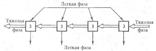 Э. осуществляют в аппаратах, наз. экстракторами, с однократным и многократным контактом фаз. Соответственно различают однократную (одноступенчатую) и многократную (многоступенчатую) экстракцию; при этом ступенями разделения служат отдельные аппараты или их секции. Многократная экстракция, наиболее распространенная в промышленности, проводится непрерывно и по способу движения фаз подразделяется на противоточную, полупротивоточную и перекрестноточную. Чаще всего применяют противоточную экстракцию одним экстрагентом (рис. 3) с числом ступеней обычно 5-10. Для трудноразделяемых компонентов (напр., близких по свойствам лантаноидов) число ступеней достигает 70-100.