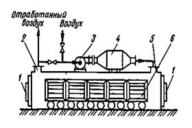 Рис. 18.13. Камерная сушилка: 1 - корпус; 2 - вагонетка; 3 - калориферы; 4 - вентилятор; 5 - шибер