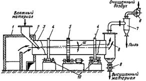 Рис. 18.19. Барабанная сушилка: 1 – топка; 2 - бункер; 3 - барабан; 4 - бандажи; 5 - зубчатое колесо; 6 - вентилятор; 7 - циклон; 8 - приёмный бункер; 9 - шлюзовой питатель; 10 - опорные ролики