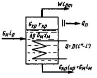 Введем обозначения: i р, i кр, iм, iвт, При кристаллизации раствора происходит образование кристаллической решетки и выделяется некоторое количество теплоты (теплота затвердевания), а при растворении вещества требуются затраты теплоты. Если растворяемое вещество вступает в химическое взаимодействие с растворителем с образованием гидратов, при этом выделяется теплота. Суммарной тепловой эффект кристаллизации в зависимости от теплоты затвердевания и образования гидратов может быть положительным или отрицательным. С учетом введенных обозначений теплота кристаллизации Q кр =Q кр r кртеплота гидратации Qr = ±Δ qG м x м Согласно схеме тепловых потоков (см. рис. 17.2) тепловой баланс можно представить равенством G н i р + G к.р r к.р ± Δ qG м x м + Di" =G кр i кр +G м i м +Wi вт +D откуда можно определить расход пара на кристаллизацию по уравнению Q=D ( D=Q/ ( В случае охлаждения раствора массовый расход: охлаждающей воды охлаждающего воздуха где: i к, i н — соответственно конечная и начальная температуры воды, °С; i к, i н — соответственно конечная и начальная энтальпии воздуха, кДж/кг.