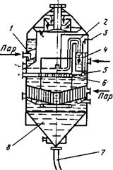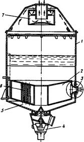 Рис. 17.3. Вакуум-аппарат с подвесной греющей камерой: 1 — корпус; 2 — греющая камера; 3 — устройство для ввода пара; 4 — циркуляционная труба; 5 — днище; 6 — греющая труба; 7 — сепаратор инерционного типа