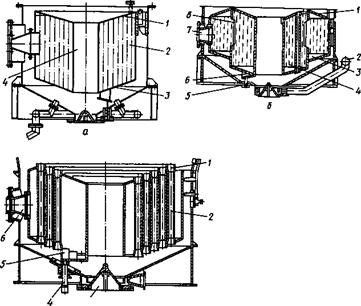 Рис. 17.4. Схемы греющих камер вакуум-аппаратов: а - с коническими трубными решетками (1 - верхняя трубная решетка; 2 - греющая труба; 3- нижняя трубная решетка; 4- циркуляционная труба); б - конической двускатной формы (1 - трубная решетка; 2 - труба для ввода продукта; 3- наружная часть греющей камеры; 4 - внутренняя часть греющей камеры; 5 - труба для отвода конденсата; 6 - карман для конденсата; 7 - штуцер для подвода пара; 8- окно); в - без трубных решеток (1 - надставка; 2 - средняя часть греющей камеры; 3- устройство для спуска утфеля; 4- труба для отвода конденсата; 5 - карман; 6- штуцер для подвода пара) Кристаллизаторы непрерывного действия состоят из концентратора, кристаллогенератора и камеры роста кристаллов. Конструкция аппарата должна обеспечивать интенсивную циркуляцию, препятствующую осаждению кристаллов в аппарате, улучшающую теплопередачу и обеспечивающую получение равномерных по величине кристаллов. На рис. 17.5 представлен вакуумный кристаллизатор непрерывного действия, применяемый в сахарном производстве. Концентратор и кристаллогенератор выполнены в виде кольцевых сегментов с трубчатой поверхностью нагрева. Концентратор герметически отделен от других узлов аппарата, что позволяет создавать в нем избыточное давление, не зависимое от давления в других частях аппарата. Кристаллогенератор верхней открытой частью соединен с надутфельным пространством камеры роста кристаллов. Камера роста кристаллов выполнена в виде цилиндра, снабженного типовой поверхностью нагрева. При помощи цилиндрической и радиальных перегородок она разделена на четыре секции.
