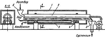 Рис. 17.6. Кристаллизатор с ленточной мешалкой: 1 -корытообразный корпус; 2 -водяная рубашка; 3 -мешалка Кристаллизаторы корытного типа довольно широко распространены в промышленности. Они просты в обслуживании и надежны в работе. Барабанные кристаллизаторы бывают с водяным и воздушным охлаждением. При воздушном охлаждении кристаллы получаются более крупными из-за низкого коэффициента теплоотдачи от раствора к воздуху, но при этом производительность кристаллизатора значительно ниже, чем при водяном охлаждении. Барабанный кристаллизатор представляет собой вращающийся цилиндрический барабан, наклоненный по ходу раствора к горизонту (рис. 17.7). Раствор поступает с верхнего конца барабана, а кристаллы выгружаются с нижнего конца. При вращении барабана кристаллизатора раствор смачивает стенки, увеличивая тем самым площадь поверхности испарения воды.