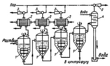 Раствор из каждого нижерасположенного корпуса разрежения засасывается в вышерасположенный корпус. Каждый корпус оснащен поверхностным конденсатором и пароструйным насосом. Вакуум в последнем корпусе создается с помощью барометрического конденсатора. Поверхностные конденсаторы охлаждаются исходным раствором. Суспензия выгружается из последнего корпуса. Такие установки просты, экономичны и используются в крупнотоннажных производствах.