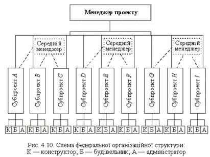 Зображена на рис. 4.9 дивізіональна структура є досить «високою» (багаторівневою), що ускладнює процеси управління командою проекту, знижує їх ефективність. Тому, щоб вирішити ці проблеми формуванням більш «плоскої» системи зв’язків, у великих проектах використовується так звана федеральна оргструктура (рис. 4.10).