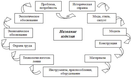 1. Обоснование возникшей проблемы и потребности. 2. Схема обдумывания. 3. Выявление основных параметров и ограничений. 4. Теоретические сведения. 5. История и современность. 6. Банк идей. 7. Эскизная проработка базового варианта. 8. Требования к изделию. 9. Дизайн-спецификация. 10. Инструменты и оборудование. 11. Материалы. 12. Правила безопасности во время работы. 13. Технология изготовления. 14. Контроль качества. 15. Экологическое обоснование. 16. Экономическое обоснование. 17. Реклама. 18. Самооценка. 19. Словарь терминов. 20. Литература.