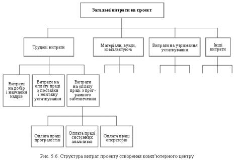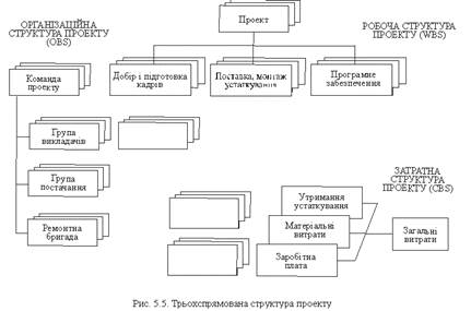 Трьохспрямована структура проекту (рис. 5.5) створюється додаванням до двоспрямованої структури третьої — структури затрат (Cost Breakdown Structure — CBS). CBS утворюється за алгоритмом, аналогічним алгоритму створення WBS і OBS (рис. 5.6). Перший рівень — це всі витрати на проект. Другий рівень — основні елементи CBS: матеріали, вузли, комплектуючі; витрати на утримання устаткування; трудові витрати; інші витрати. Третій рівень — подальша розбивка. Як показано на рисунку 5.6, для трудових витрат це будуть: витрати на добір і навчання; витрати на оплату праці з поставки і монтажу устаткування; витрати на оплату праці з програмного забезпечення. Четвертий рівень — подальша розбивка, наприклад, для оплати праці з програмного забезпечення: оплата праці програмістів; оплата праці системних аналітиків; оплата праці операторів. Ця структура дає змогу збирати інформацію про затрати, аналізувати й готувати звіти по затратах будь-якого підрозділу або елементу робіт. Таким чином, проведена за всіма напрямами структуризація проекту формує необхідну інформацію для подальшого планування і контролю його строків, ресурсів і затрат.