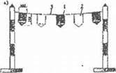 Сигнальные ограждения а) сигнальный шнур с цветными флажками; б) сигнальная лента; 1-красный цвет, 2 -белый цвет; 3-шнур; 4-опора (резиновая).