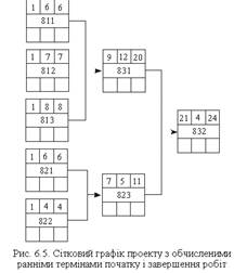 4-й крок. Визначення ранніх термінів початку і закінчення проектних робіт шляхом «прямого проходження». Як видно з рис. 6.5, наведений сітковий графік має кілька так званих шляхів. Шлях — це послідовність взаємопов’язаних робіт від початку до завершення виконання проекту. У нашому прикладі можна назвати таких принаймні три: ІІІ. 811 — 831 — 832; ІІІ. 821 — 823 — 832; ІІІ. 822 — 823 — 832. Можна аналізувати й обчислювати тривалість кожного з наявних у проекті шляхів, у наведеному прикладі перший три- ватиме 22 тижні (6 + 12 + 4), другий — 15 тижнів (6 + 5 + 4), третій — 13 тижнів (4 + 5 + 4). Але нас цікавить найтриваліший шлях, оскільки решта шляхів будуть коротшими за тривалістю, тому найтриваліший і визначить термін виконання усього проекту. Проте як це зробити, якщо проект припускає багато шляхів, а обчислення послідовно кожного з них вимагає багато часу? Для цього обчислюють так звані ранні терміни початку і завершення робіт прямим проходженням від першої до останньої роботи проекту (див. рис. 6.5). Ранній початок (ES — Early Start) — найбільш ранній можливий термін початку роботи. Раннє закінчення (EF — Early Finish) — найбільш ранній можливий термін завершення роботи. Ці параметри обчислюються за такими формулами: EFi = ESi + ti – 1; [6.1] ESi + 1 = EFi + 1, [6.2] де EFi — ранній термін завершення і-ї роботи; ESi — ранній термін початку і-ї роботи; ti — тривалість і-ї роботи; ESi + 1 — ранній початок роботи і + 1. З рисунка 6.5 видно, що найбільш ранній початок роботи 811 — перший тиждень (і це зрозуміло, бо це є початок проекту), а завершення — шостий тиждень. Щоб визначити, коли розпочинається наступна, 831, робота, треба знайти ранні закінчення усіх попередніх робіт, а потім скористатися таким правилом: при проведенні обчислень ранніх термінів, якщо певна робота виконується після кількох попередніх, ранній термін початку цієї роботи визначається з огляду на найпізніший з ранніх термінів закінчення попередніх робіт. Так, оскільки робота 831 виконується після робіт 811 (завершується на шостому тижні), 812 (закінчується на сьомому тижні) і 813 (завершується на восьмому тижні), то терміном її раннього початку, відповідно до [6.2] і зазначеного вище правила, найдоцільніше визначити дев’ятий тиждень (8 + 1). Розрахунки показали, що виконання проекту триватиме 24 тижні (відповідно до показника раннього завершення останньої роботи). Таким чином, цей крок дає можливість визначити тривалість усього проекту. У нашому прикладі виконання проекту завершується однією роботою. Якщо ж — декількома паралельними роботами, то тоді тривалість проекту визначається як найбільша величина з ранніх термінів завершення решти робіт. 5-й крок. Визначення пізніх термінів початку і завершення робіт «зворотним проходженням». Цей крок передбачає обчислення зазначених параметрів у зворотному порядку — від останньої роботи проекту до першої. Пізній початок (LS — Late Start) — найпізніший можливий термін початку роботи, після якого затримка вплине на строк завершення виконання усього проекту. Пізнє закінчення (LF — Late Finish) — найпізніший можливий термін завершення роботи. Ці терміни обчислюються за такими формулами: LSi = LFi – ti + 1; [6.3] LFi – 1 = LSi – 1. [6.4] Рисунок 6.6 ілюструє обчислення даних параметрів для нашого прикладу. Обчислюючи пізні терміни, користуються таким правилом: якщо після певної роботи йдуть дві паралельні, то пізнє завершення цієї роботи в