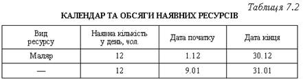 Як бачимо з таблиці, під час різдвяних свят зазначений ресурс відсутній. На підставі наведеної інформації маємо гістограму наявності ресурсів (рис. 7.1). Отже, таблиця і гістограма не пов’язуються з роботами, а просто фіксують кількість наявних ресурсів у розрізі календарного часу. Вони дають змогу проконтролювати, чи не заплановані якісь роботи у періоди, коли відсутні ресурси (державні, релігійні свята і т. ін.)