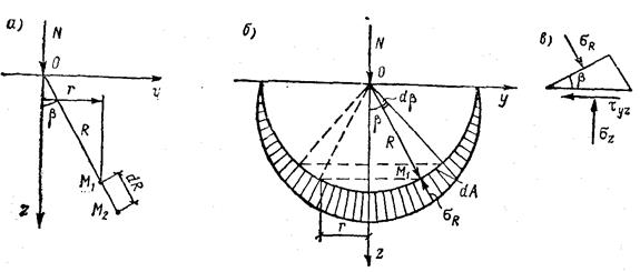 Рассмотрим действие вертикальной сосредоточенной силы N, приложенной в точке О к горизонтальной плоскости, являющейся поверхностью линейно-деформируемого полупространства, простирающегося в бесконечность ниже этой плоскости (рис. 6.2, а). От действия силы N во всех точках полупространства возникает сложное напряженное состояние. В общем случае в каждой точке полупространства, несколько удаленной от точки О, в декартовой системе координат будет действовать шесть составляющих Пусть положение точки М1 (рис. 6.2, а) определяется полярными координатами R и β системы координат с началом в точке приложения силы N. Под действием силы N точка М1 переместится в направлении радиуса R на величину S1. Чем дальше от точки О будет расположена точка М1, тем меньше будет ее перемещение; при R =∞ перемещение точки М1 будет равно нулю. Следовательно S1 можно принять обратно пропорциональным R. В то же время при одном и том же значении R для различных величин угла β перемещения точек будут неодинаковы. Наибольшее перемещение получит точка, расположенная на оси z, т. е. при β = 0. С увеличением угла β перемещения по направлению радиуса R уменьшаются, и в случае β =90° (на поверхности грунта) при малых деформациях будут равны нулю. В связи с этим можно принять, что перемещение точки М1 по направлению радиуса, кроме зоны около точки приложения силы N, будет