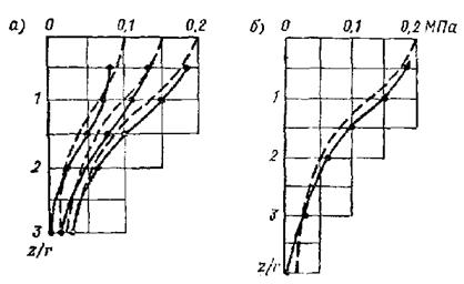 Рис. 6.11. Эпюры напряжений по опытам А.В. Голли (а) и В.М. Чикишева (б)