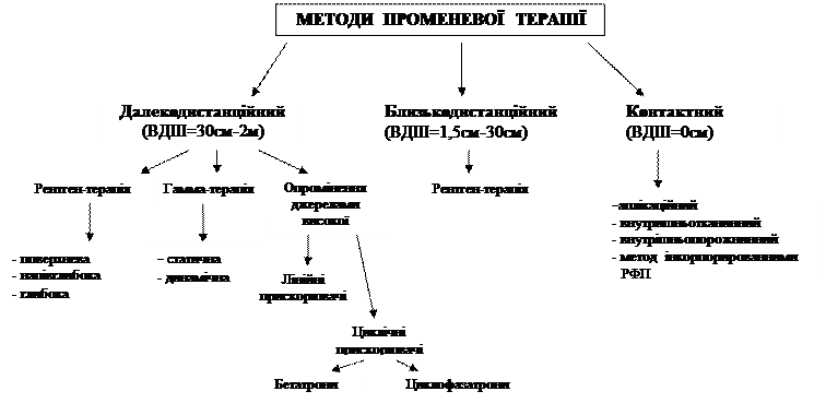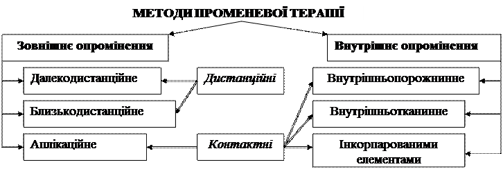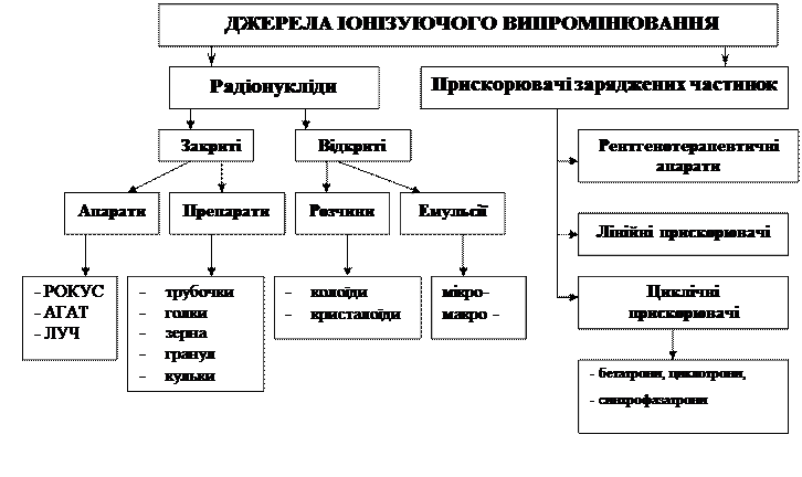 Відкриті радіонукліди – це, у переважній більшості, рідкі радіоактивні препарати зі змішаним випромінюванням, які знаходяться в такій оболонці або в такому фізичному стані, при якому можливо їх розповсюдження в оточуюче середовище. Відкриті радіоактивні джерела застосовуються у вигляді розчинів, які в свою чергу поділяються на кристалоїди і колоїди, а також – у вигляді мікро- та макросуспензій. Закриті джерела випромінювання мають захисну оболонку-фільтр або знаходяться у такому фізичному стані, при якому неможливе їх розповсюдження в оточуюче середовище. Закриті джерела (60Со, 137Cs, 192Ir) застосовуються в апаратах для далекодистанційної променевої терапії. Для проведення контактних методів променевої терапії закриті джерела використовуються у вигляді металевих трубочок, циліндрів, кульок, голок. Джерелами іонізуючого випромінювання являються також прискорювачі заряджених часток, які поділяються на: 1. Рентгенотерапевтичні апарати (далекодистанційн та близько дистанційні). 2. Лінійні прискорювачі, в яких прискорюються електрони, які безпосередньо використовуються для опромінення, або електрони, які гальмуються і перетворюються в гальмівне рентгенівське випромінювання високої енергії. 3. Циклічні прискорювачі (циклотрони, циклофазотрони), в яких прискорюються важкі іони (ядра водню, дейтерію, вуглецю, аргону). Зовнішнє опромінення проводиться апаратами, в яких джерело іонізуючого випромінювання знаходиться на різній відстані до поверхні тіла хворого (відстань-джерело-шкіра – ВДШ). До зовнішніх методів опромінення відносяться: 1.Далекодистанційна променева терапія (ВДШ від 30 см до 1, 5-2 м). 2.Близькодистанційна променева терапія (ВДШ від 1, 5 см до 30 см). 3. Аплікаційний метод променевої терапії (ВДШ від 0 до 1, 5 см). До внутрішніх методів опромінення відносяться: 1.Внутрішньопорожнинна променева терапія. 2. Внутррішньотканинна променева терапія. 3.Терапія інкорпорованими радіактивними препаратами. Всі методи внутрішнього опромінення і аплікаційний метод відносяться до контактних методів променевої терапії. При аплікаційному методі джерело випромінювання розташовується безпосередньо на поверхні, яка підлягає опроміненню; безпосереднє введення джерела випромінювання в пухлину трактується, як внутрішньотканинний метод опромінення. Розміщення джерела випромінювання в природних порожнинах тіла хворого називається внутрішньопорожнинним методом променевої терапії.