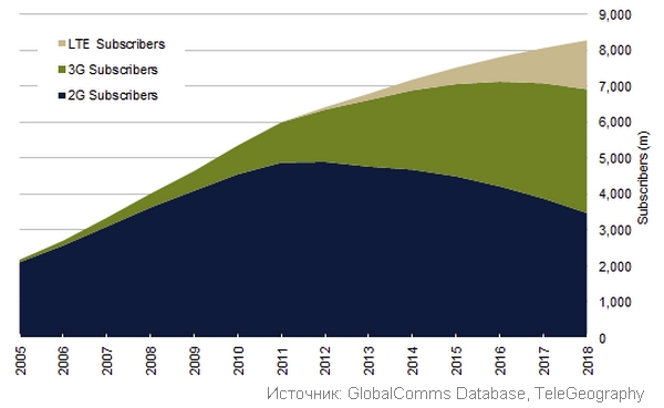 Рисунок 4.1 – Прогноз числа абонентов сетей 2G/3G/LTE в мире