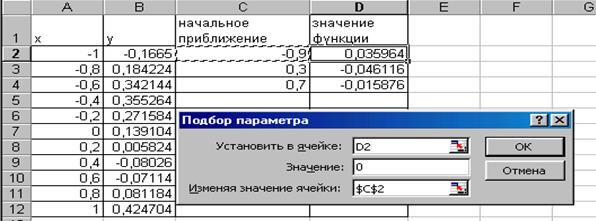 Упражнение 2: Решение уравнения х3-0, 01х2-0, 7044х+0, 139104=0 методом подбора. 1. Возьмем интервал [-1; 1] с шагом 0, 2. Для этого: Введите в ячейку А2 значение –1, а в ячейку А3- значение –0, 8. Выделив две ячейки, протяните маркером заполнения до значения 1. 2. В ячейку В2 введите формулу: =А2^3-0.01*A2^2-0.7044*A2+0.139104 (левая часть уравнения), маркером заполнения заполните остальные значения. (получили таблицу значений) 3. Обратите внимание что функция меняет знак на интервалах [-1; -0.8], [0.2; 0.4], [0.6; 0.8], за начальные приближения к корню разумно взять средние точки интервалов. 4. Занесите их в ячейки С2; С3; С4 5. В ячейку D2 введите формулу: =С2^3-0.01*С2^2-0.7044*С2+0.139104, маркером заполнения протяните в остальные ячейки. 6. Выделите ячейку D2. 7. Выберите команду Сервис/Подбор параметра. На экране отобразится окно Подбор параметра. 8. В поле Установить в ячейке отобразится ячейка D2. 9. В поле Значения введите 0. Здесь указывается значение правой части уравнения. 10.