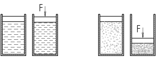 Рис. 1.3. Сжатие жидкостей и газов В гидравлике рассматриваются реальная и идеальная жидкости. Идеальная жидкость в отличие от реальной жидкости не обладает внутренним трением, а также трением о стенки сосудов и трубопроводов, по которым она движется. Идеальная жидкость также обладает абсолютной несжимаемостью. Такая жидкость не существует в действительности, и была придумана для облегчения и упрощения ряда теоретических выводов и исследований. На жидкость постоянно воздействуют внешние силы, которые разделяют на массовые и поверхностные. Массовые: силы тяжести и инерции. Сила тяжести в земных условиях действует на жидкость постоянно, а сила инерции только при сообщении объему жидкости ускорений (положительных или отрицательных). Поверхностные: обусловлены воздействием соседних объемов жидкости на данный объем или воздействием других тел.