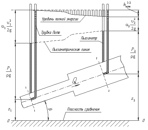 Дело в том, что при движении реальной вязкой жидкости возникают силы трения, на преодоление которых жидкость затрачивает энергию. В результате полная удельная энергия жидкости в сечении 1-1 будет больше полной удельной энергии в сечении 2-2 на величину потерянной энергии (рис.3.6).